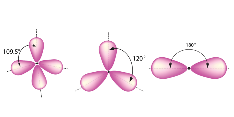 Dado que el tipo de unión (determinado por el tipo de hibridación) determina el ángulo de enlace, a su vez existen tres posibles geometrías moleculares cuando el carbono participa en la formación de un enlace químico: