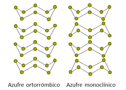 El azufre puede formar distintas sustancias simples cuyas estructuras dependen de cómo están enlazados los átomos de azufre. A estas distintas sustancias simples se les llama alótropos, y se forman cuando se enlazan de forma diferente átomos de un mismo elemento. Los alótropos más conocidos del azufre son el azufre monoclínico y el azufre ortorrómbico, y sus estructuras se representan como: