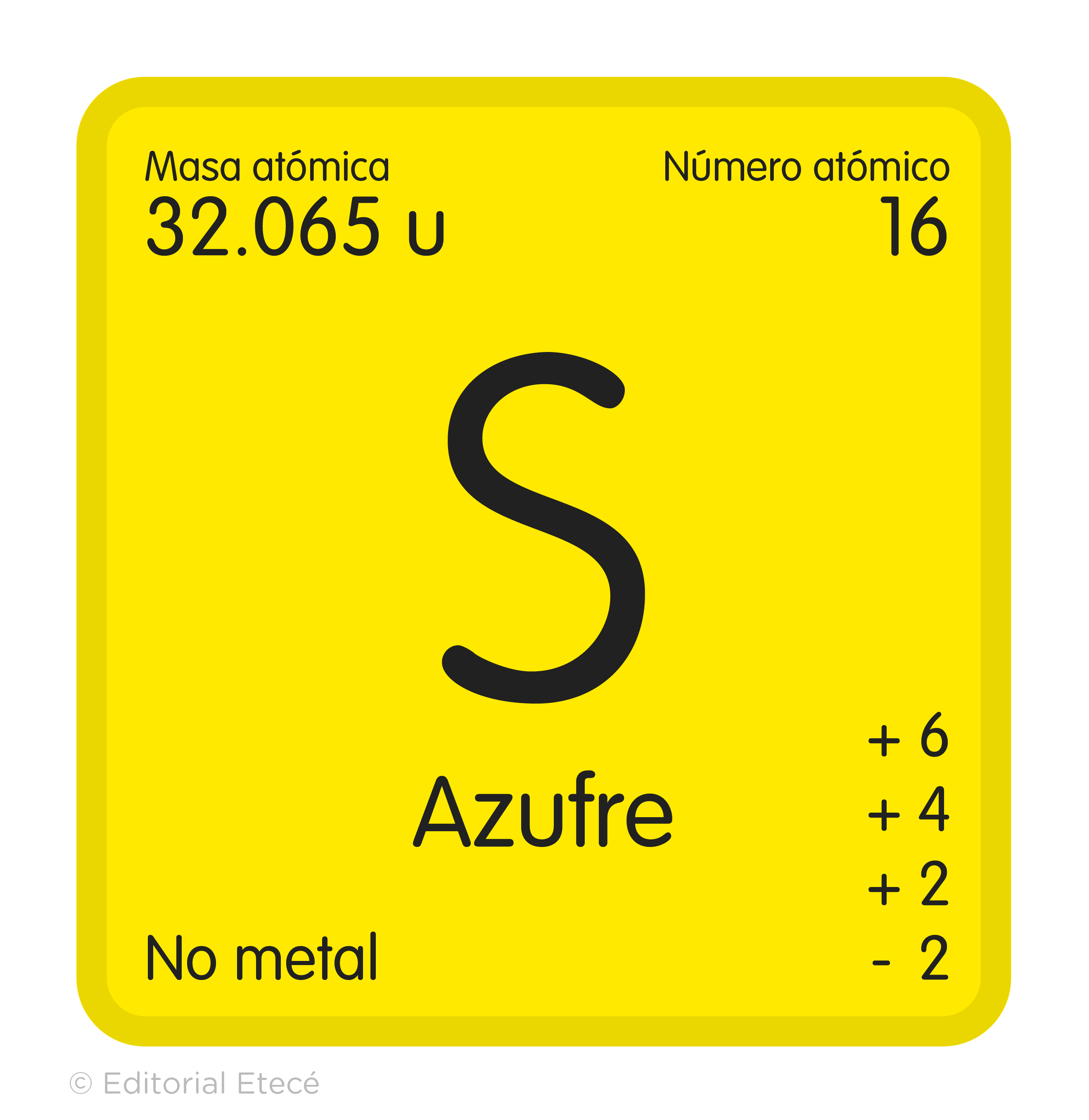 El azufre es un elemento químico de la Tabla Periódica que se representa con el símbolo S. Tiene número atómico 16 y masa atómica 32.065 uma. Es un elemento no metálico que se puede encontrar de color amarillo fuerte, marrón o anaranjado.