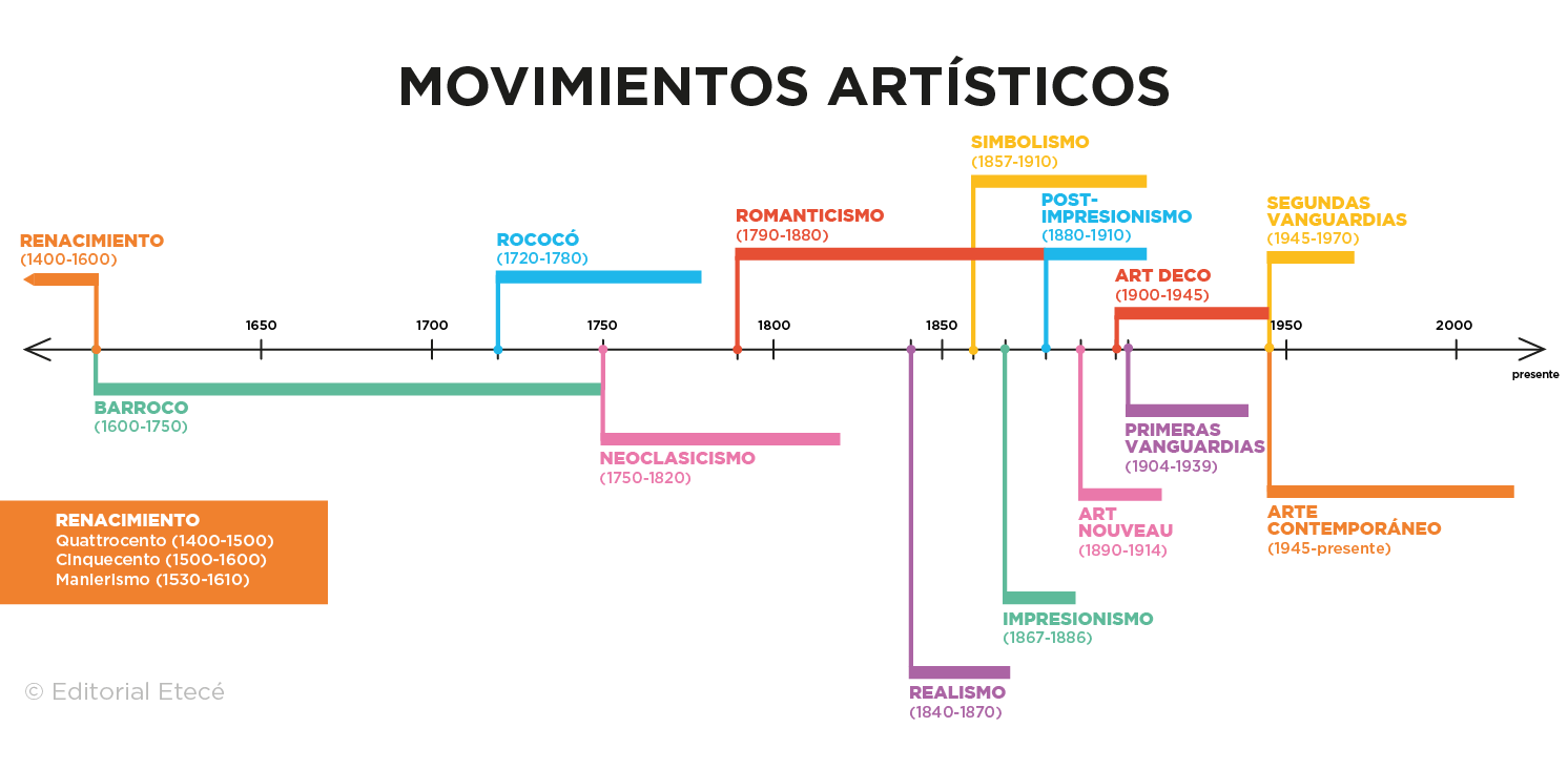 - Abarca las tendencias artísticas desde mediados del siglo XX hasta hoy, según la periodización más extendida. Otros autores lo consideran desde el impresionismo (aproximadamente 1860) y para algunos lo contemporáneo es solo aplicable a la producción posterior a 1960. Los criterios de periodización dependen de lo que se considere una real “ruptura”.