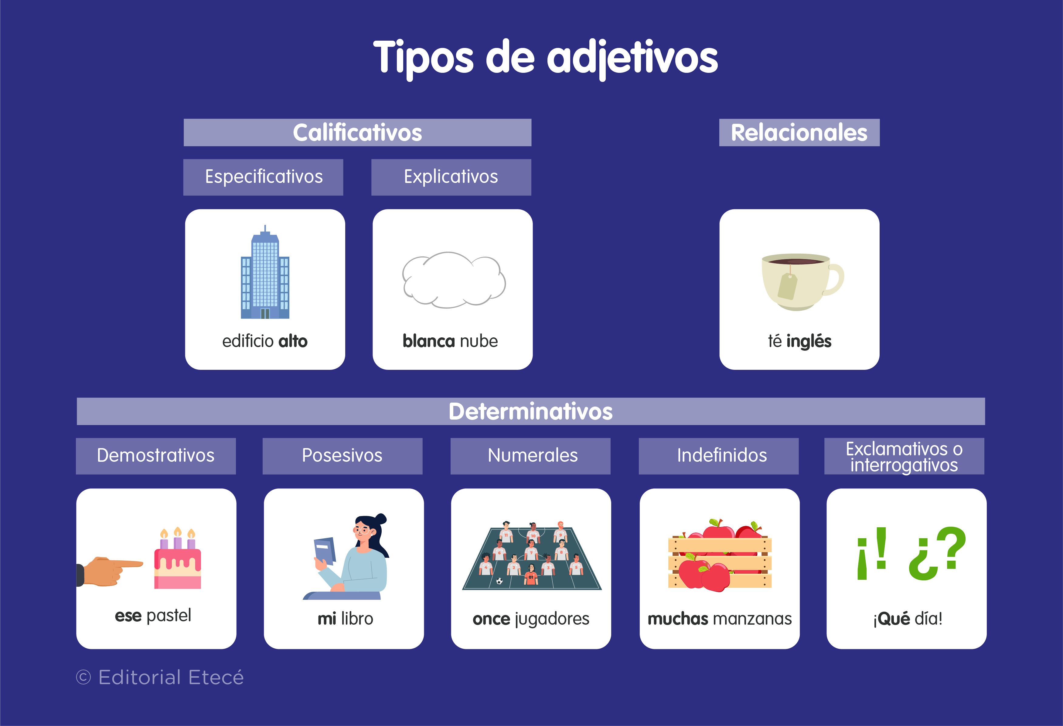 - Adjetivos exclamativos e interrogativos. Introducen oraciones exclamativas o interrogativas. Por ejemplo: qué día, cuántos chicos, cuál deseo.