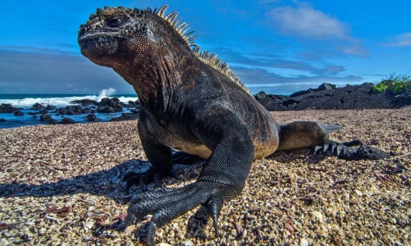 - La iguana marina. Es un reptil endémico de las islas Galápagos y el único lagarto que depende del agua del mar, ya que se alimenta de algas. El macho tiene la capacidad de nadar mientras que la hembra y las crías permanecen en las rocas y esperan a que suba la marea para poder comer. Su piel es de coloración oscura, lo que permite se camufle entre las piedras.