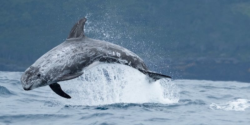 - Delfín gris. También conocido como “calderón gris” es una especie de cetáceo odontoceto. Puede alcanzar una longitud de 3,5 metros y pesar 350 kilogramos. Se caracteriza por su piel gris y abundantes marcas alargadas blancas que parecen cicatrices. Se alimenta de calamares y pequeños peces. Es sociable y anda en grupos entre 5 y 30 delfines.