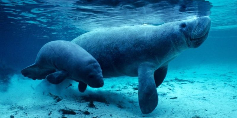 - El manatí. También conocido como “vaca marina”, es parecido a la ballena, pero más pequeño. Su piel es de color gris, su cola tiene forma de cuchara y tiene bigotes en el hocico. Es nocturno y se alimenta de plantas del agua. Tiene muy buen sentido de la vista y del olfato.