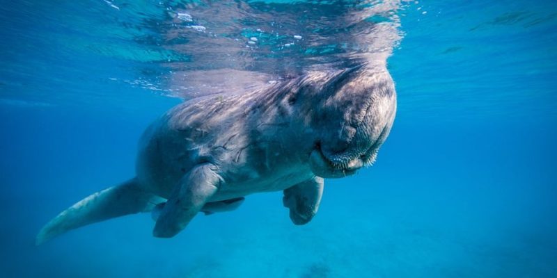 - El dugongo (Dugong dugon). Es un mamífero que vive en zonas costeras de los océanos Índico y Pacífico, este de África y sudeste de Asia y Oceanía. Se alimenta solo de algas y puede estar más de quince minutos debajo del agua sin salir a respirar.