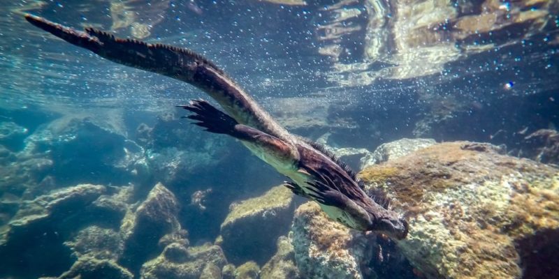 - La iguana marina (Amblyrhynchus cristatus). Es un reptil escamoso que habita en las islas Galápagos (un archipiélago del océano Pacífico). Al alcanzar la adultez, su dermis toma un color verde oscuro. A pesar de sus afiladas garras y dientes, es herbívora. Se alimenta de algas y plantas acuáticas, que puede arrancar incluso de entre las rocas.