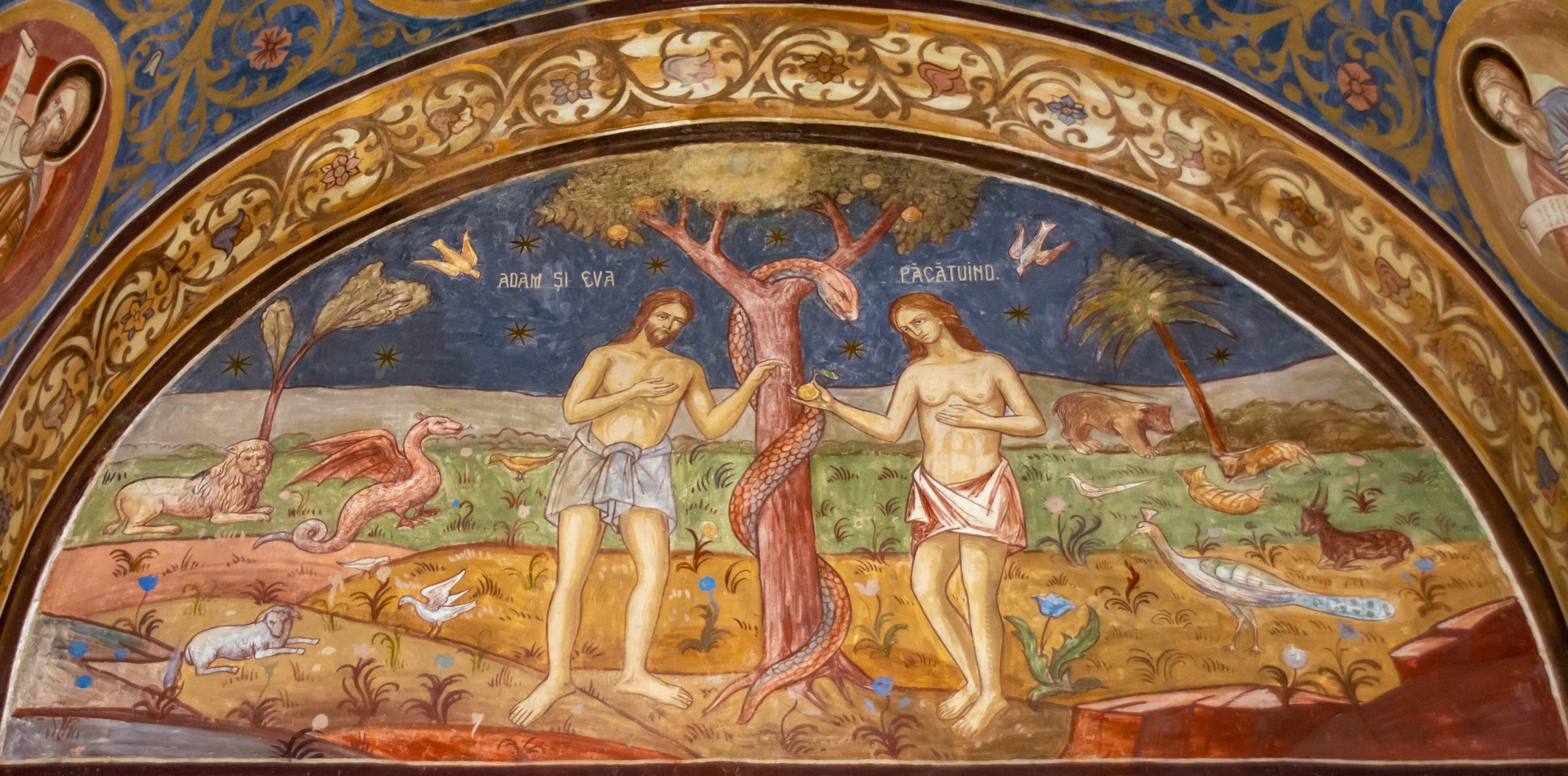 Pintura en la pared sobre Adán y Eva