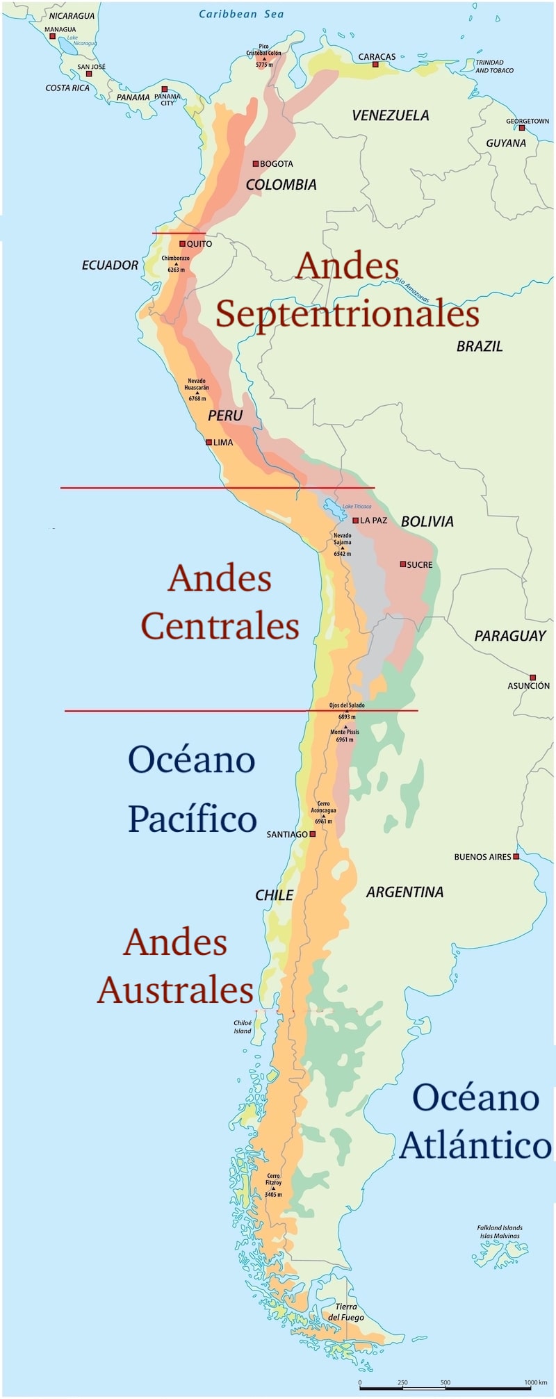 A lo largo de su recorrido, la cordillera de los Andes se divide en tres grandes sectores: los Andes septentrionales, los Andes centrales y los Andes australes. Cada uno de ellos presenta rasgos particulares en cuanto a su estructura geológica, altitud, clima y biodiversidad.