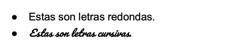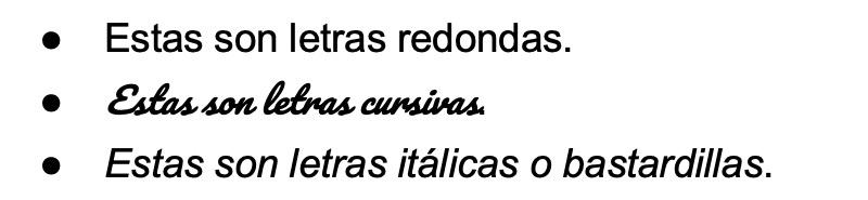 Sin embargo, con el desarrollo de la imprenta y la popularización de la lectura, y más aún con la masificación de la computadora, el término “cursivas” adquirió un nuevo sentido, reservado hasta entonces para las llamadas bastardillas o itálicas, que son letras redondas pero levemente inclinadas para recordar a la escritura de corrido. Así: