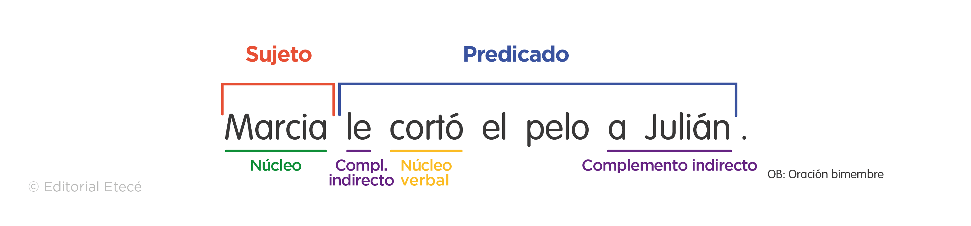 Además, dentro de la oración suele presentar una duplicación obligatoria con el pronombre átono dativo, es decir, suele ir acompañado, pero no sustituido, del pronombre «le» o «les», como se puede observar en la oración “Maritza le compró un ramo de flores a su madre”, en la que identificamos: