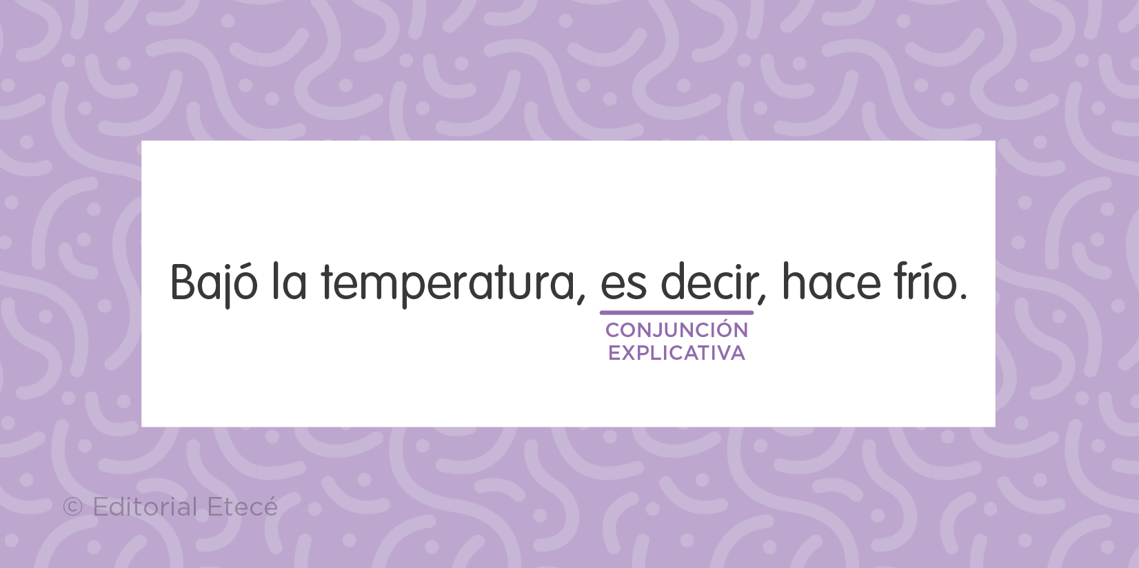 Las conjunciones explicativas enlazan dos elementos con el mismo sentido y/o significado pero distinta forma, porque el segundo es una explicación o aclaración sobre el primero. Estas conjunciones siempre se escriben entre comas. Por ejemplo: Antonio llegó a las nueve, o sea, llegó tarde a la reunión.