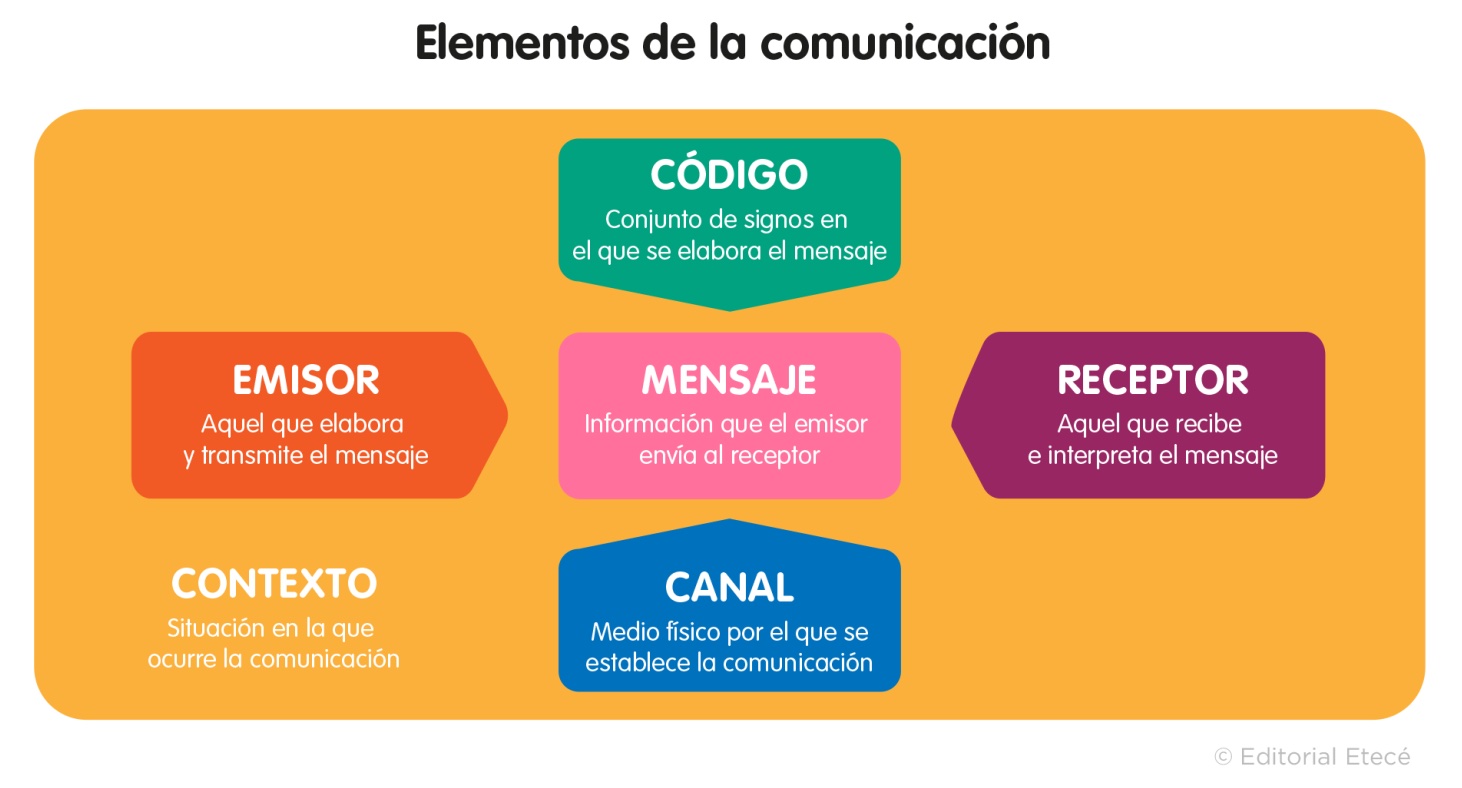 Son emisor, receptor, mensaje, canal, código y contexto.