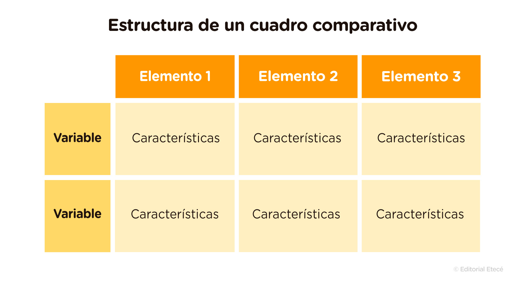 - Dos o más elementos. Son los nombres de los objetos, los conceptos o los hechos que se comparan. Suelen ir en la primera fila, uno por columna.