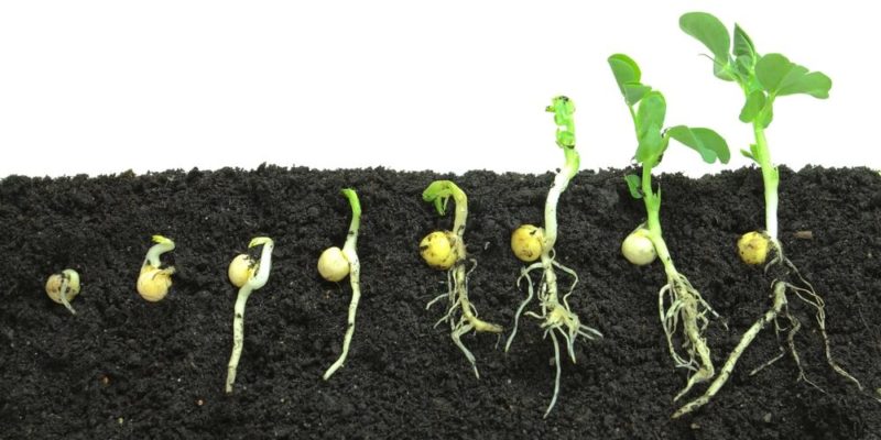 - Germinación. Las semillas, esporas o brotes que disponen de los recursos necesarios para nacer, lo harán de manera paulatina, mediante el desarrollo lento de las estructuras necesarias para nutrirse (raíces) y luego para hacer fotosíntesis (hojas).
