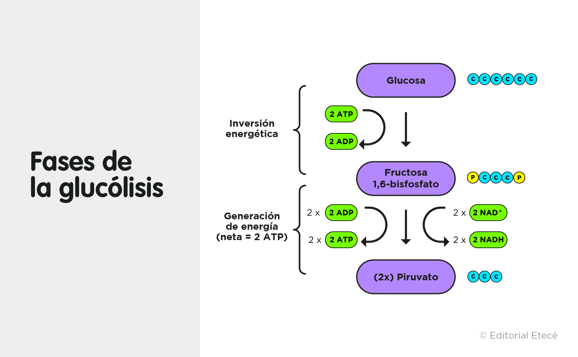 La glucólisis es un conjunto de reacciones químicas que rompen la molécula de glucosa (con 6 átomos de carbono) para dar dos de piruvato (con 3 átomos de carbono cada una). Como se trata de reacciones de degradación, el resultado de la glucólisis es la liberación de energía química, que se almacena como molécula de ATP (adenosín trifosfato).