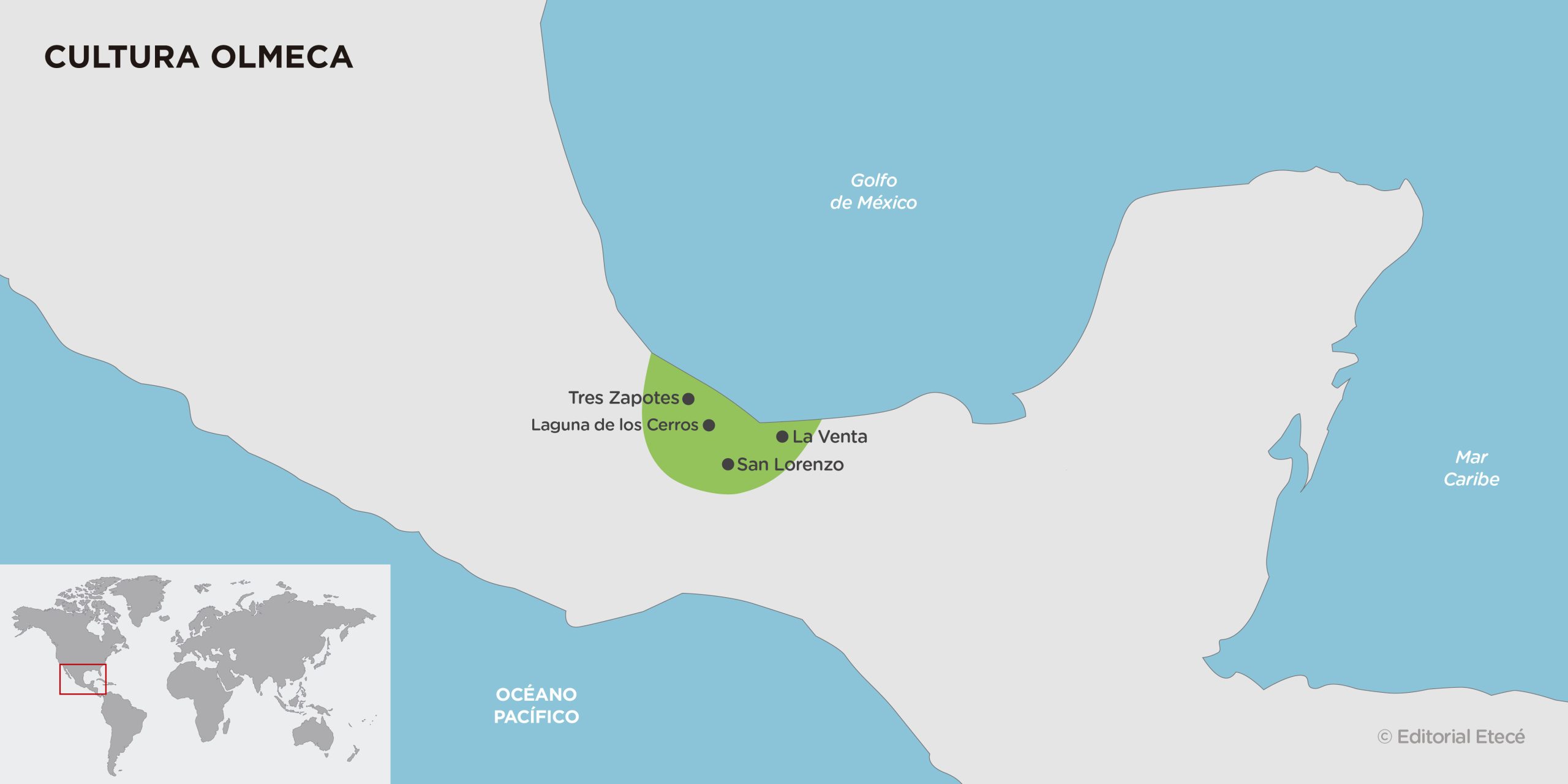 Los olmecas surgieron en la región del sudeste del actual México, en el sur del estado de Veracruz y el oeste de Tabasco, en la costa del golfo de México. Posteriormente, su influencia se extendió a lo largo y ancho de la región mesoamericana, en los territorios de las actuales Guatemala, Belice, El Salvador, Nicaragua, Honduras y algunos estados de México.