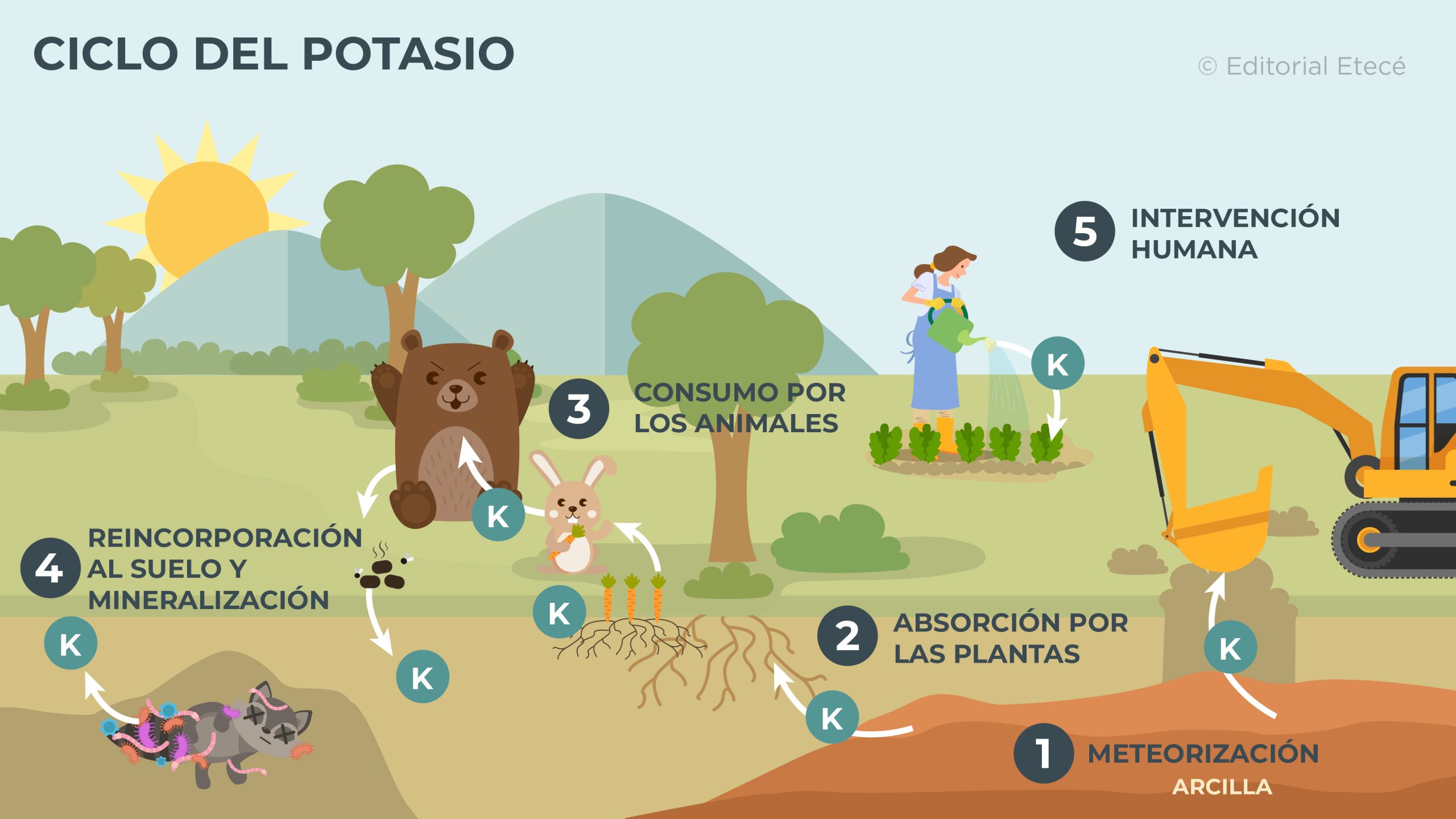 - Reincorporación al suelo y mineralización. El potasio se reincorpora al suelo cuando mueren plantas y animales, que se descomponen liberando el potasio. También se libera potasio al suelo a través de los excrementos y la orina de los animales.