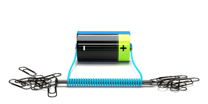 - Campos magnéticos provenientes de corriente. Toda carga en movimiento produce un campo magnético. Por eso, una corriente eléctrica también produce un campo magnético. Por ejemplo: los electroimanes (como el de la figura superior) son dispositivos en los que por medio de una batería se hace circular corriente por un cable enrollado en un metal. Esta corriente genera un campo magnético a su alrededor que magnetiza el metal y generando otro campo magnético. Así, los electroimanes se utilizan para generar campos magnéticos variables ya que cambiando la corriente, cambia el campo magnético.