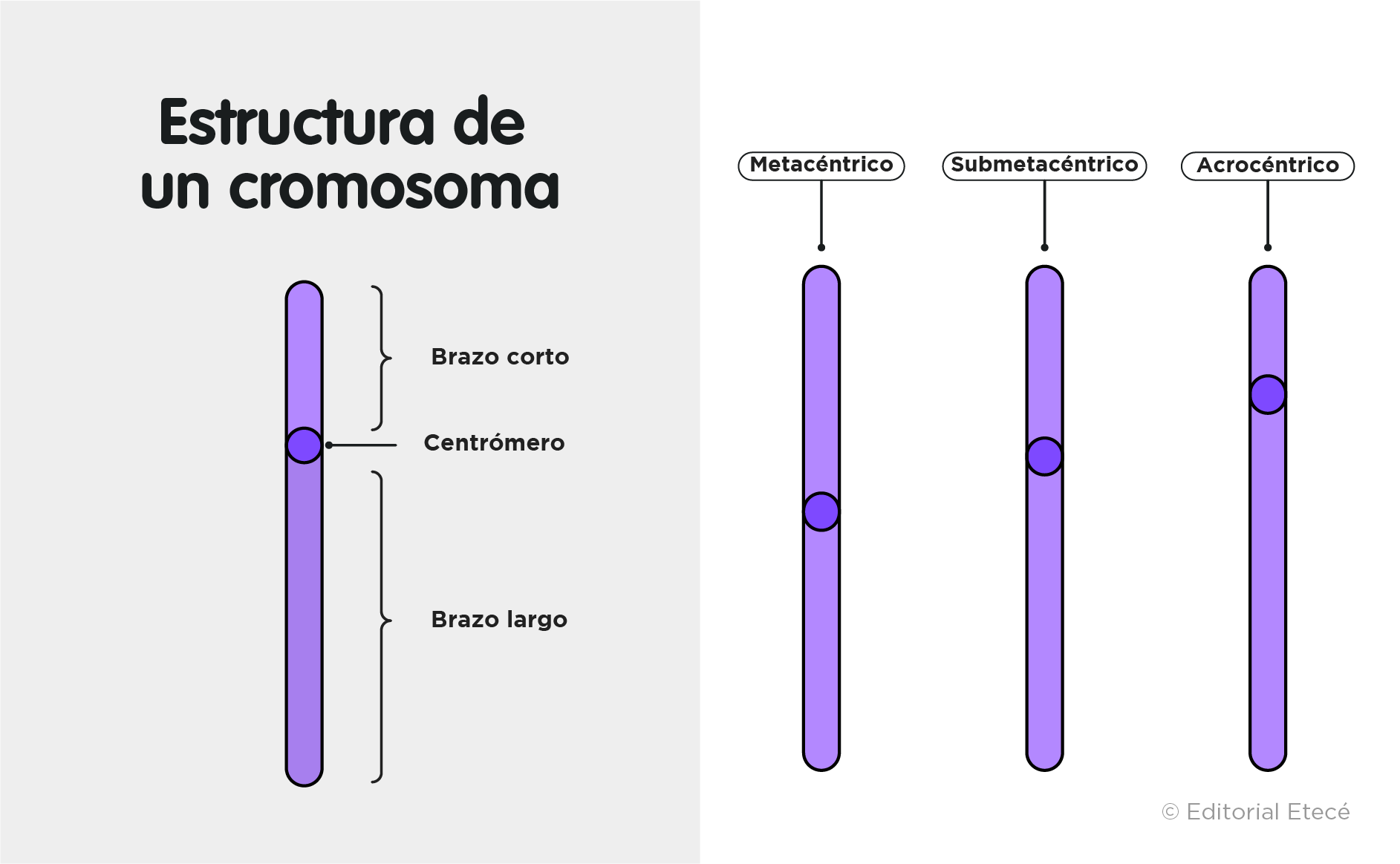 El centrómero de los cromosomas divide a cada uno en dos brazos: uno corto (brazo p) y uno largo (brazo q).
