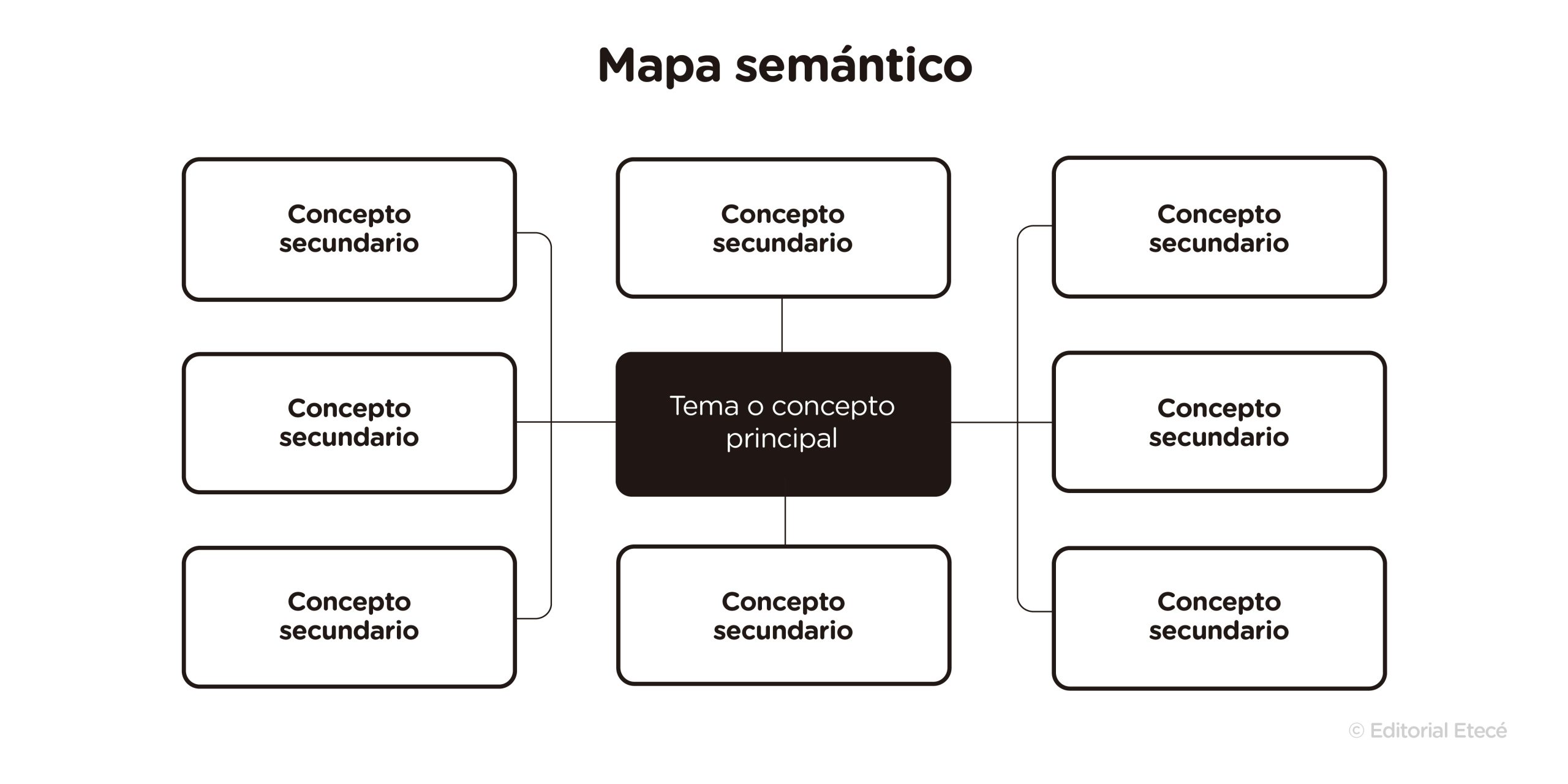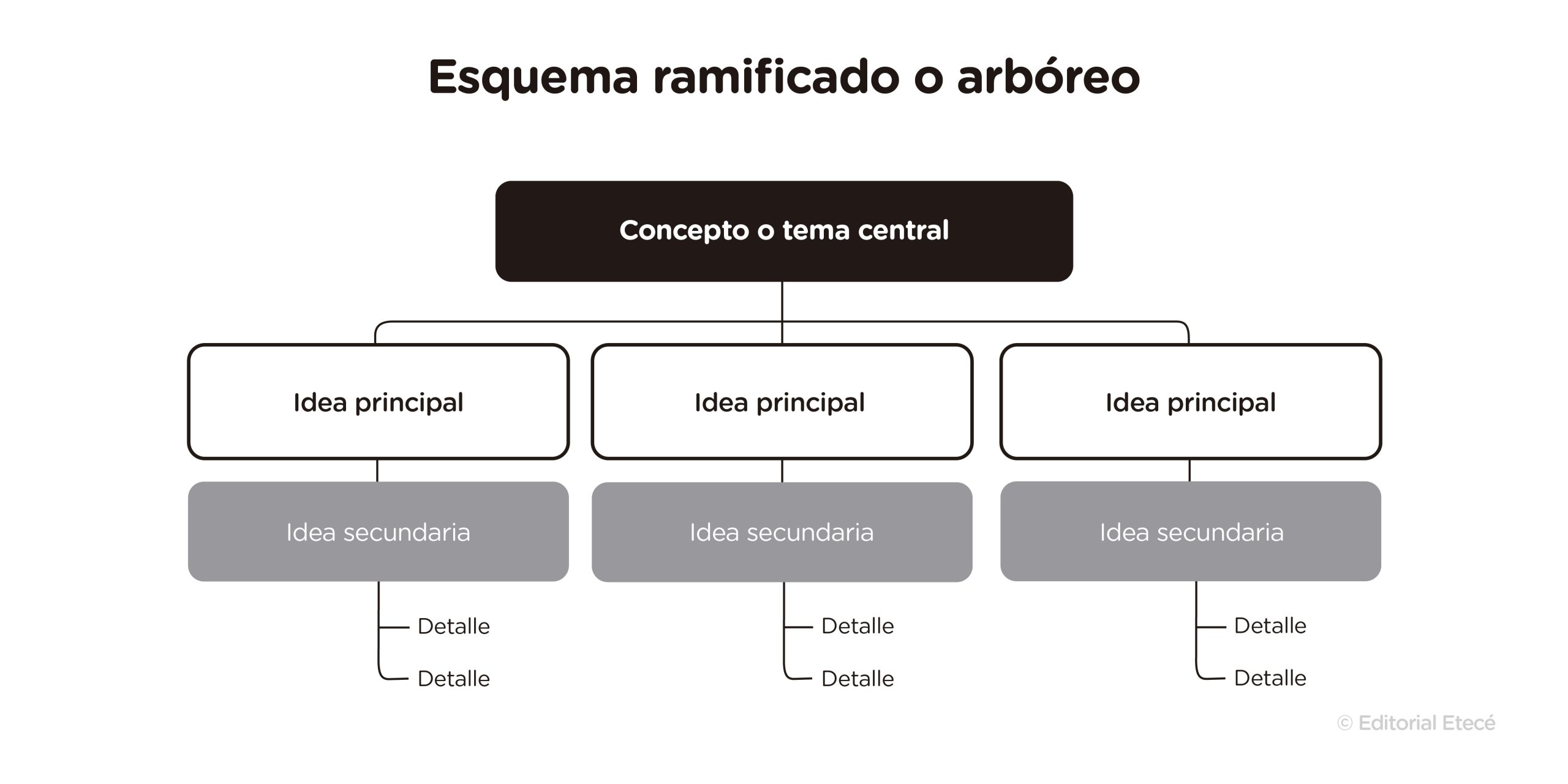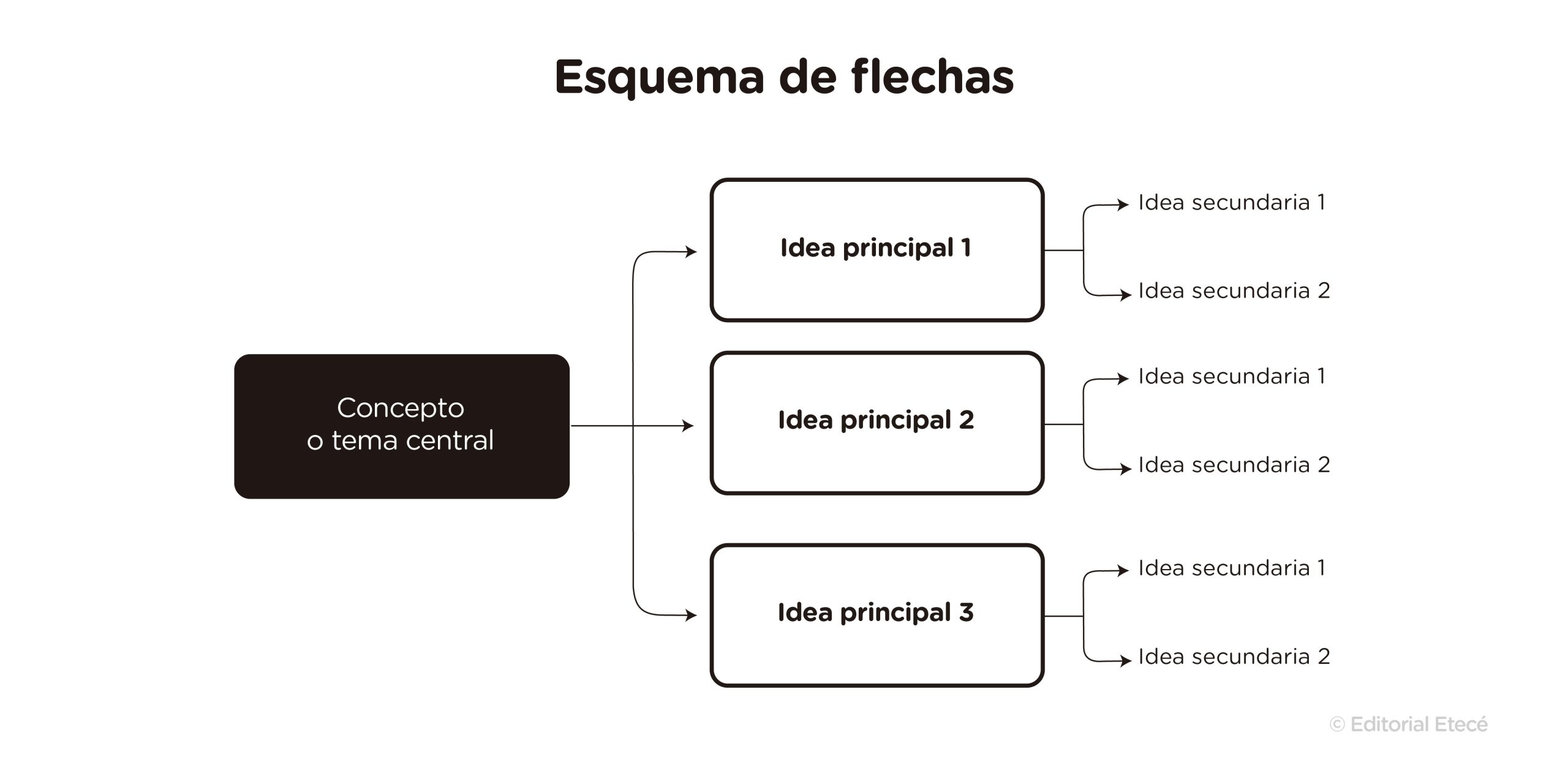 En todos los esquemas, se parte de un concepto central. Mediante líneas, flechas u otras marcas gráficas, se muestra cómo las ideas o los conceptos principales, secundarios o terciarios se vinculan con el tema principal y entre sí. De esta forma, se menciona y se representa de forma estructurada la información más importante sobre un tema o un texto.