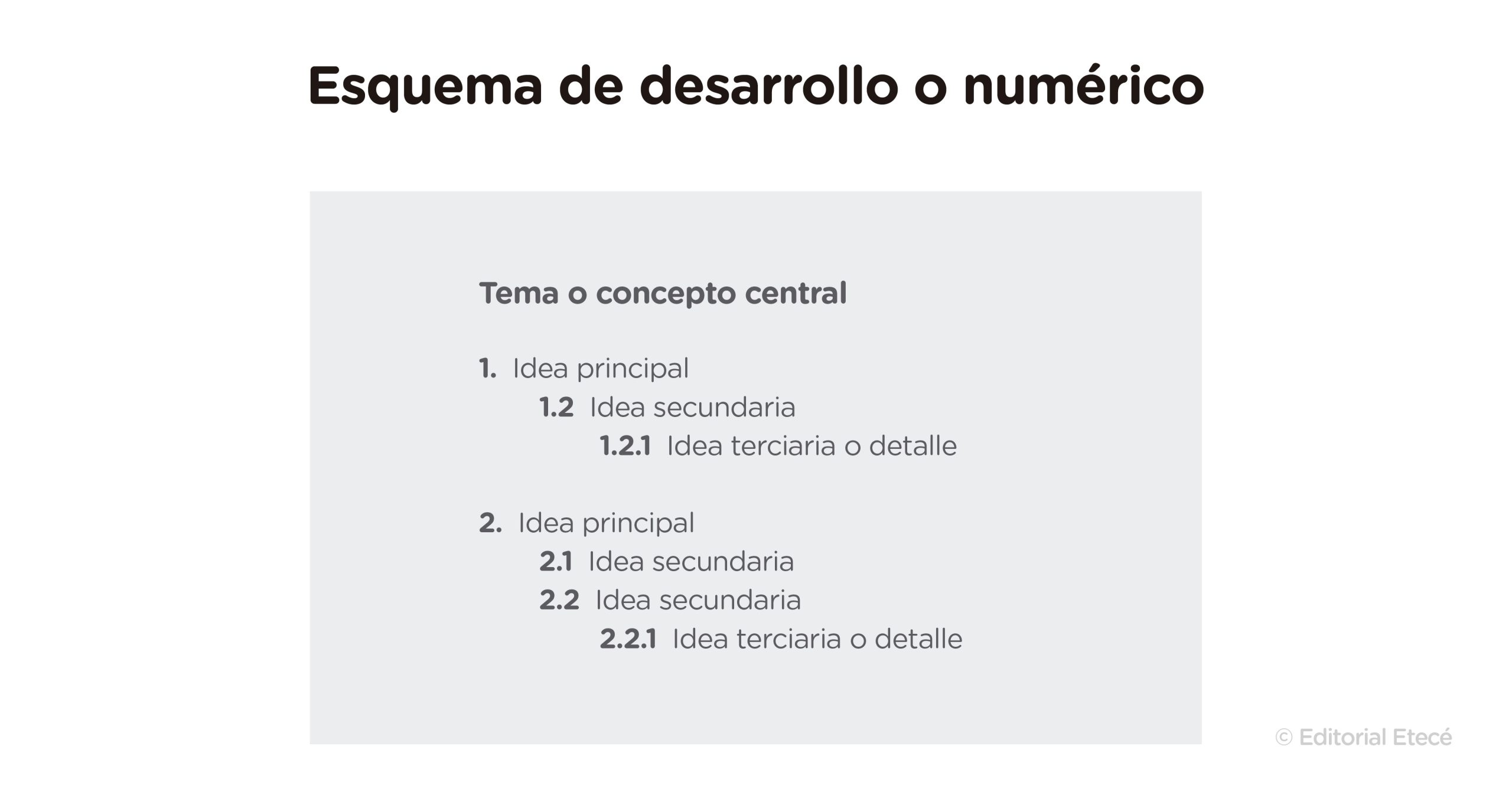 El esquema de desarrollo o numérico es aquel que mediante números o letras, puntos y sangrías indica la jerarquía de los conceptos. Parte de un tema o concepto central que funciona como título y luego se añaden las ideas principales, secundarias o terciarias indicando su relevancia y su orden.